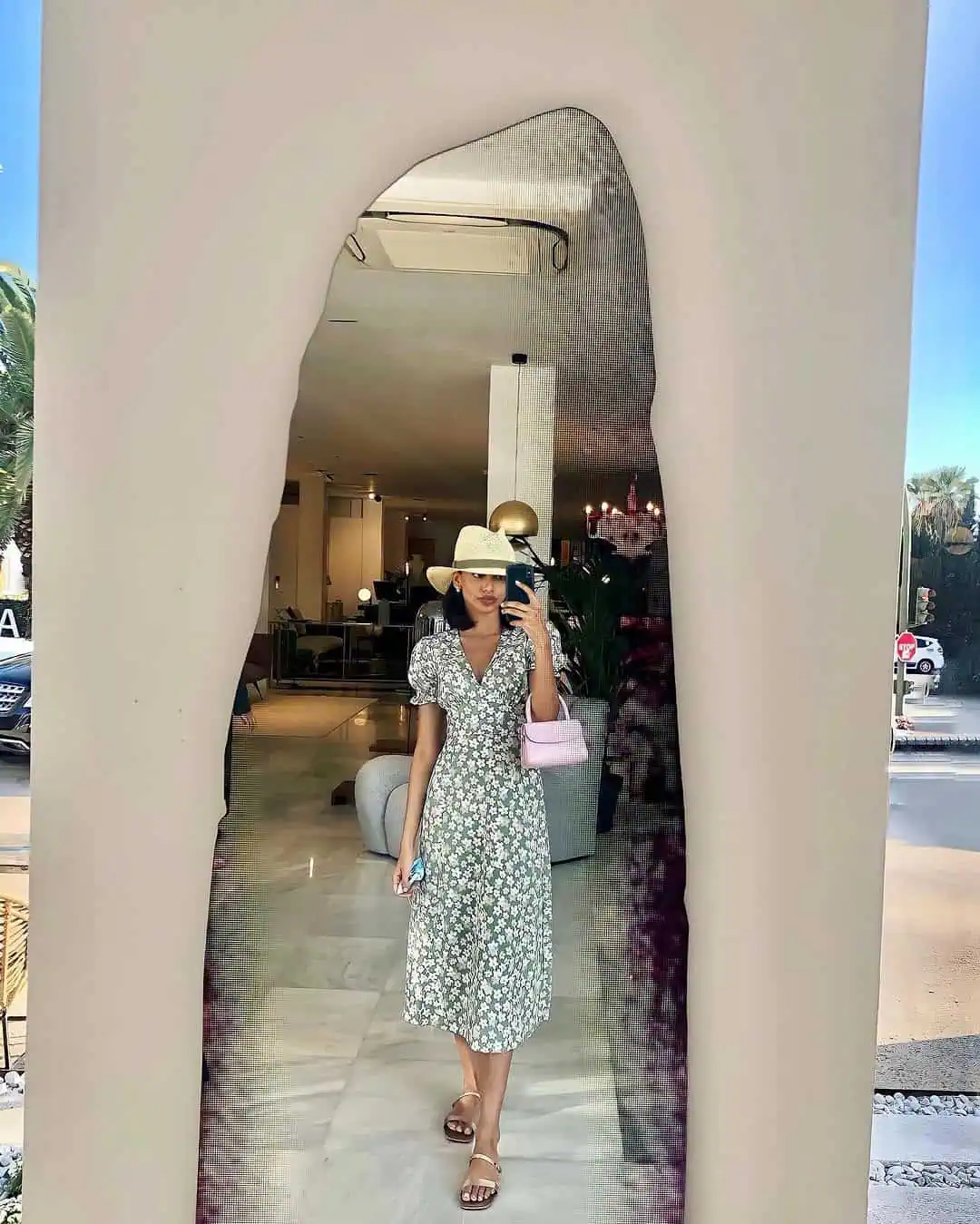 Lastly, Banita Sandhu delivers a chic vacation-ready look. She wears a green floral midi dress featuring puffed sleeves and a modest neckline. To complete the look, she adds a beige hat and a mini handbag. As a result, the outfit appears subtle, elegant, and perfect for summer getaways. Clearly, Bollywood Divas inspire summer vacation styles for many followers.