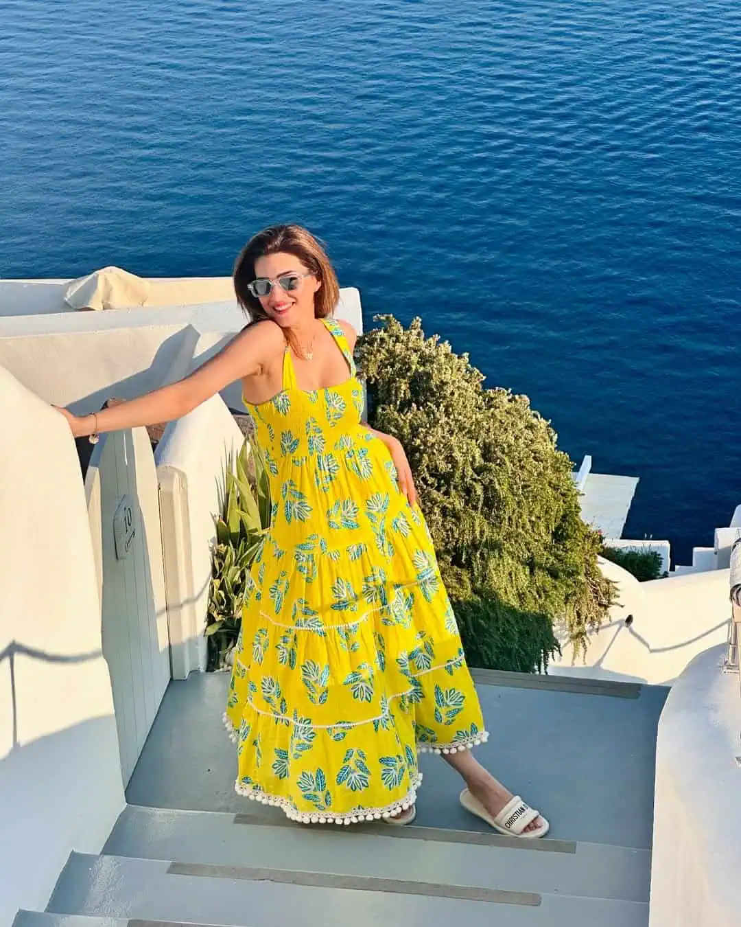 Similarly, Kriti Sanon embraces bright summer hues in a yellow ankle-length dress. The vibrant blue floral prints enhance the outfit’s charm. In addition, she pairs the look with stylish sunglasses and minimal accessories. Ultimately, her ensemble feels fresh, light, and perfect for warm weather.